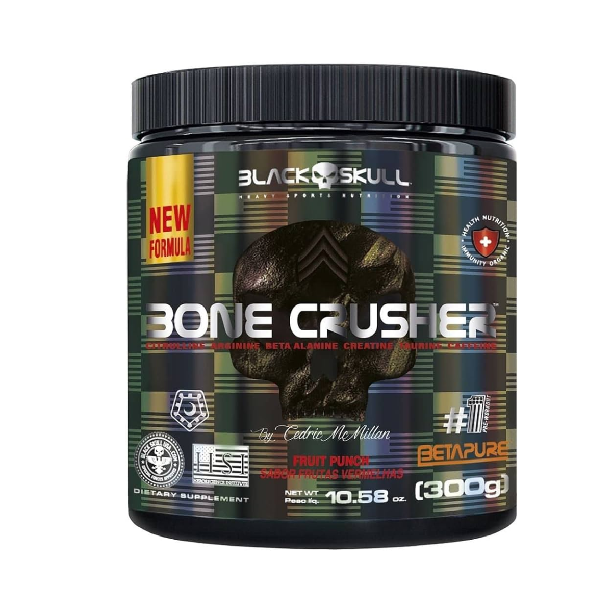 Beta alanina, creatina monohidratada, arginina, taurina, cafeína anidra, C. Crispus invernal, acidulante ácido cítrico, aromatizantes, antiumectante dióxido de silício, edulcorante sucralose e corante artificial vermelho 40. NÃO CONTÉM LACTOSE. NÃO CONTÉM GLÚTEN.